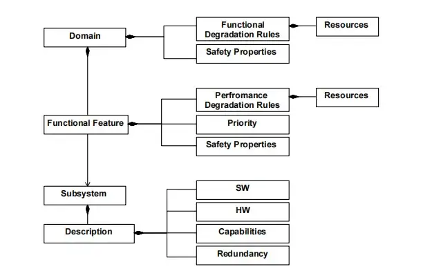 为确定终止哪些功能,需为每个功能特征分配优先级。当发生失效时,功能可实施适配策略,通过性能降级来节省资源。功能特征由不同的子系统构成,子系统则由硬件、软件、冗余和能力属性定义。性能降级规则基于子系统的可用性和性能。