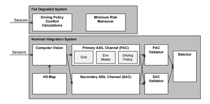 正常集成系统负责轨迹计算。计算机视觉平台向主 ASIL 通道(PAC)和次 ASIL 通道(SAC)的电子控制单元提供信息。两个通道分别生成独立的环境模型。基于该环境模型,PAC 应用计算无碰撞的车辆轨迹;同时,SAC 也利用计算机视觉信息计算最小风险轨迹。之后,PAC 验证器和 SAC 验证器分别对两条轨迹进行碰撞检查。根据多项性能和安全要求,为每条轨迹分配一个分数。选择器根据这些分数选择最优轨迹。
