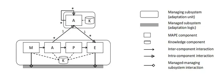 系统健康管理(SHM)的自适配策略通过 MAPE-K 循环实现。MAPE-K 循环涉及五项活动,分别是监控(Monitoring)环境和 / 或系统、分析(Analyzing)数据以发现差异、规划(Planning)可能的适配策略、基于建模知识(Knowledge)执行(Executing)适配操作。