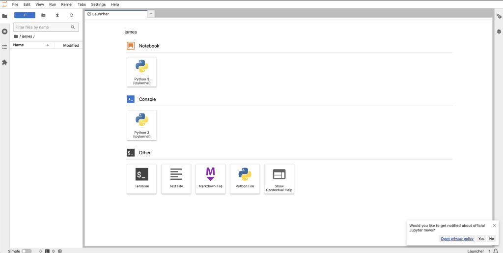这应该会在您的本地浏览器中打开 Jupyter Labs 环境! 从这里开始,我们就可以自由地与 Jupyter 交互,进行 AI、ML(机器学习)和数据科学方面的编码工作了。