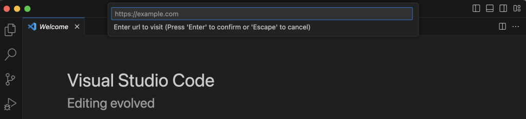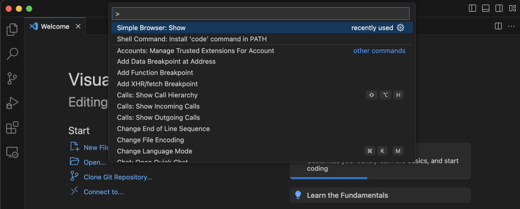 连接成功后,在 VS Code 的欢迎页面,您需要执行最后一步:同时按下 “Command” + “Shift” + “P”(Windows/Linux 用户为 “Ctrl” + “Shift” + “P”)。搜索并打开 “Simple Browser”(简单浏览器)窗口。