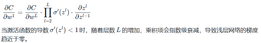 梯度消失问题的数学本质可以从多个角度理解。首先,从激活函数导数的累积效应来看,考虑一个具有L层的神经网络,每层使用相同的激活函数,则第 1 层的梯度可以表示为: