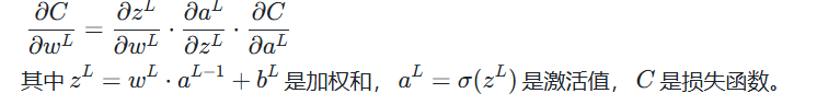 在反向传播过程中,梯度通过链式法则逐层传递,权重梯度的计算涉及多个中间变量: