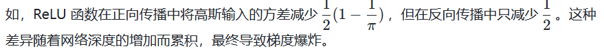 - 对于使用 ReLU 激活函数的网络,使用 He 初始化,设置权重方差为2/n。