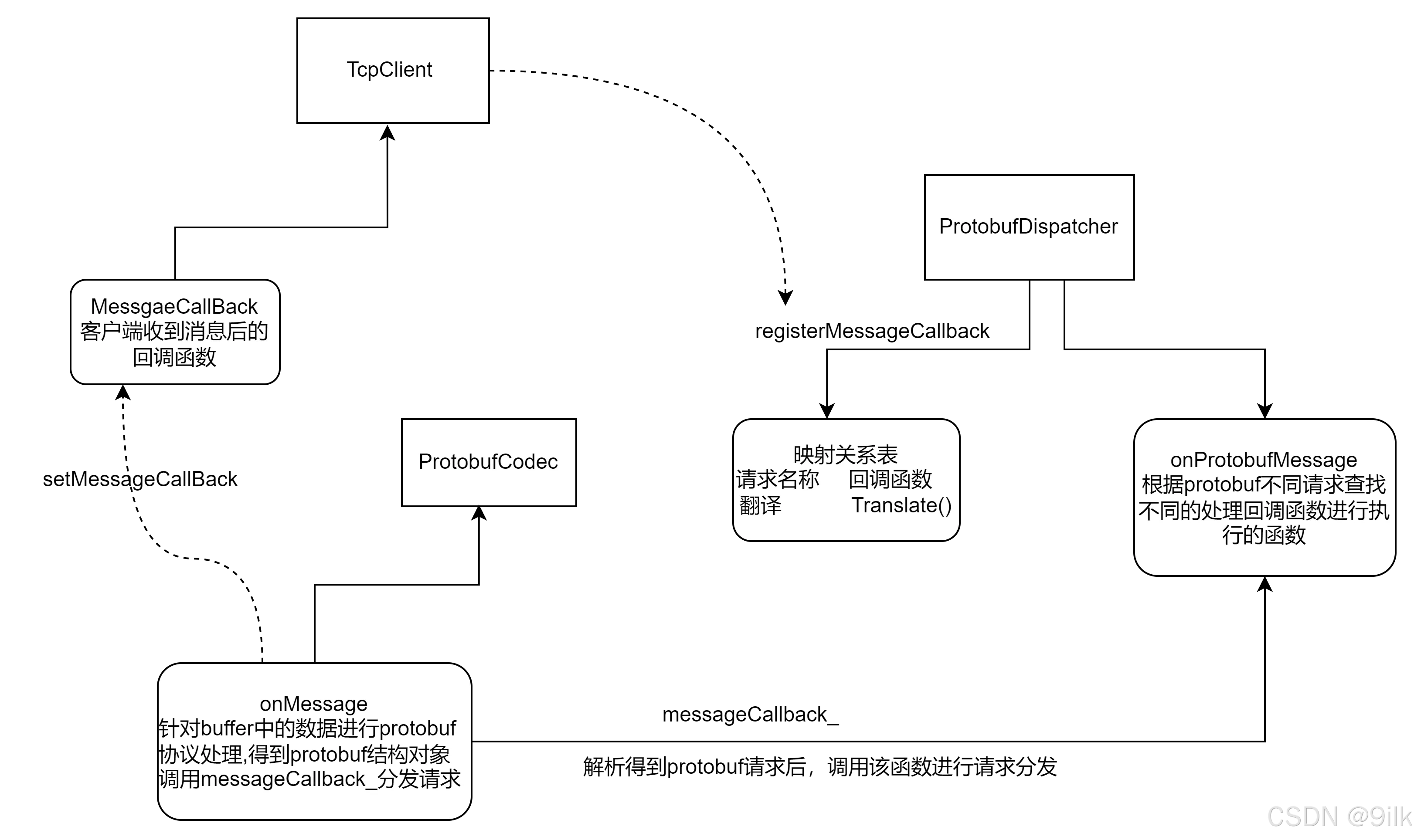 private:/* 新连接建立成功时的回调函数 */void OnConnection(const muduo::net::TcpConnectionPtr& conn){if(conn->connected() == true)cout << "连接建立成功!" << endl;else  cout << "连接建立失败!" >> endl;}/* 通信连接收到请求时的回调函数*/void OnMessage(const muduo::net::TcpConnectionPtr& conn,muduo::net::Buffer* buf,muduo::Timestamp time){//1.将数据从Buffer从取出来string data = buf->retrieveAllAsString();//2.调用translate处理请求string result = translate(data);//3.发送响应conn->send(result);}private:muduo::net::EventLoop _baseloop;muduo::net::TcpServer _server;