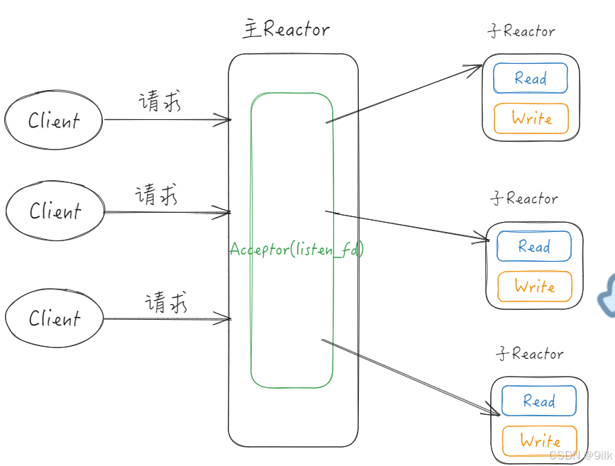 - 主从Reactor模型:主Reactor只对新建连接事件进行监控(保证不受IO阻塞影响实现高效的新建连接获取);从Reactor针对新建连接进行IO事件监控(进行IO操作和业务处理)