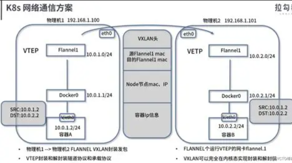 - Node1 上的 - flanneld进程通过路由表识别到目标 IP 属于 Node2 的子网,将数据包封装成 VXLAN 格式(外层源 IP:192.168.1.10,目标 IP:192.168.1.11)。