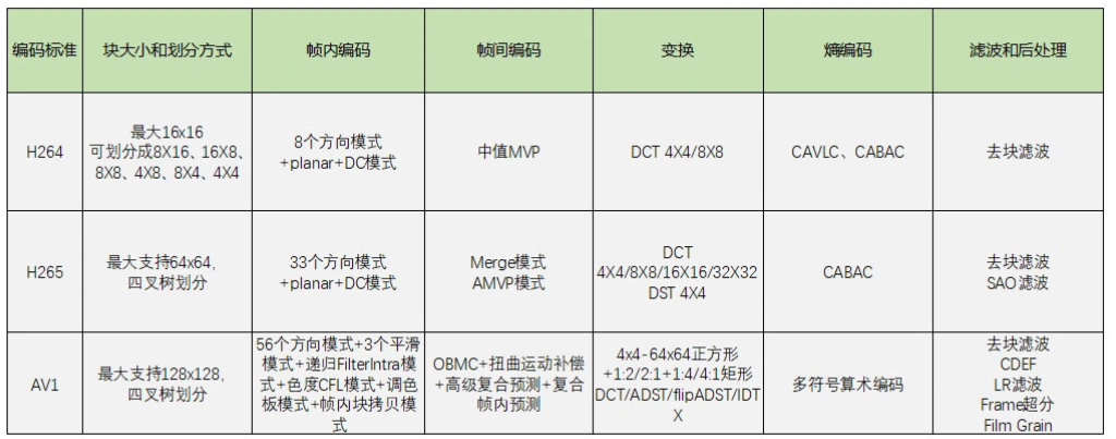 现在市面上常见的编码标准有 H264、H265、VP8、VP9 和 AV1。目前 H264 和 VP8 是最常用的编码标准,且两者的标准非常相似。H265 和 VP9 分别是他们的下一代编码标准,这两个标准也非常相似。AV1 是 VP9 的下一代编码标准。