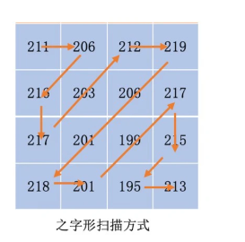 对于一个 YUV 图像,我们把它划分成一个个 16x16 的宏块(以 H264 为例),Y、U、V 分量的大小分别是 16x16、8x8、8x8。这里我们只对 Y 分量进行分析(U、V 分量同理)。假设 Y 分量这 16x16 个像素就是一个个数字,我们从左上角开始之字形扫描每一个像素值,则可以得到一个“像素串”。如下图所示: