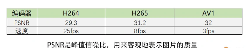 如下图,可以看到相同码率下,AV1 清晰度稍好于 H265,而 H264 最差,但是编码耗时则相反,AV1 最高,H265 次之,H264 速度最快。
