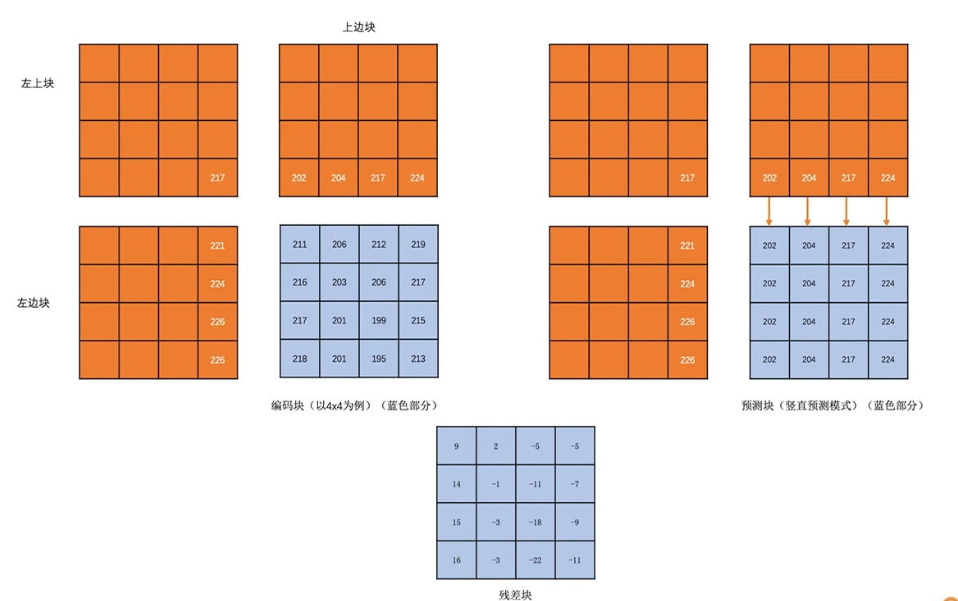 2、帧内预测:为了提高熵编码的压缩率,先将当前编码块的相邻块像素经过帧内预测算法得到帧内预测块,再用当前编码块减去帧内预测块得到残差块,从而去掉空间冗余。