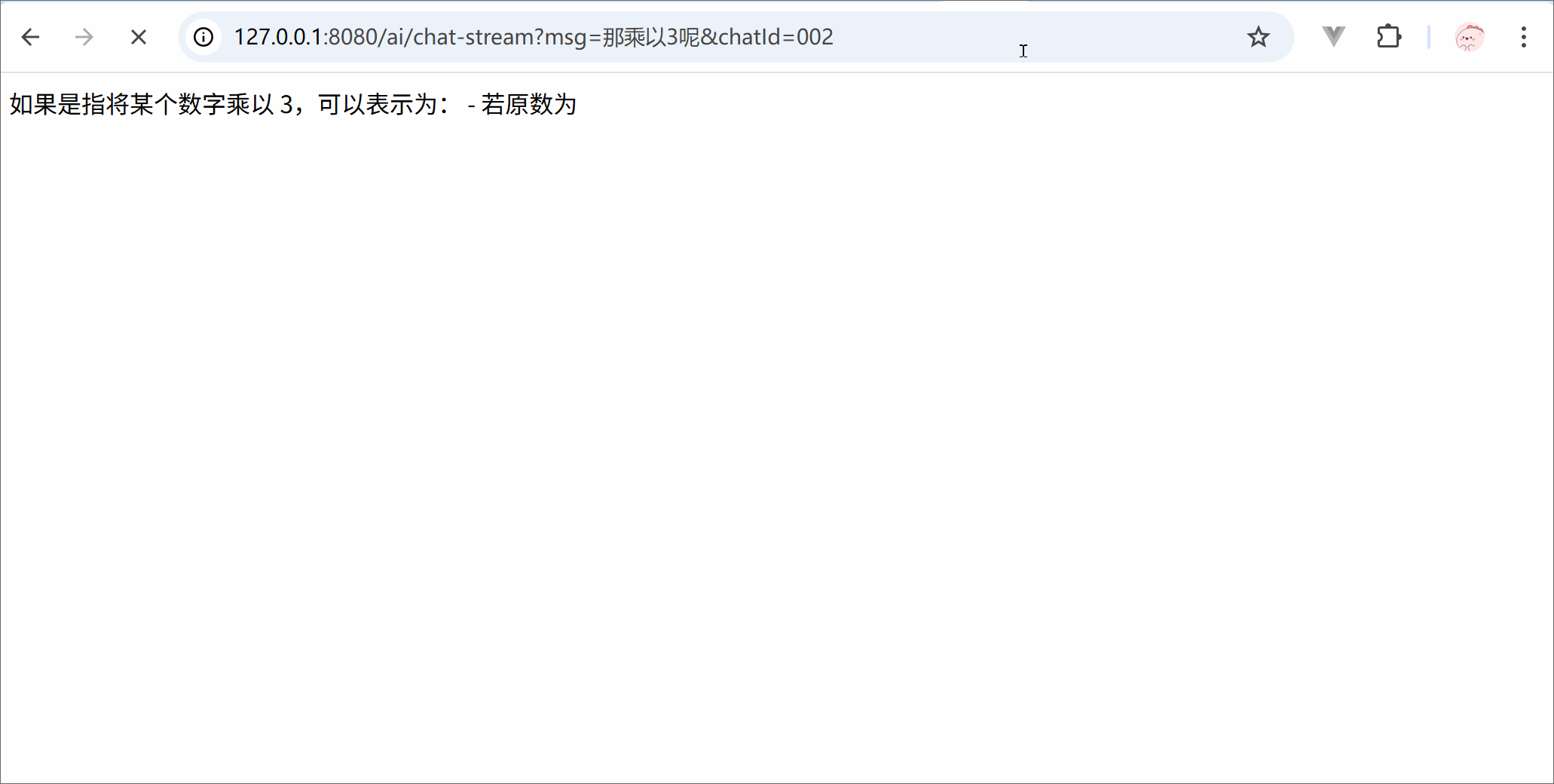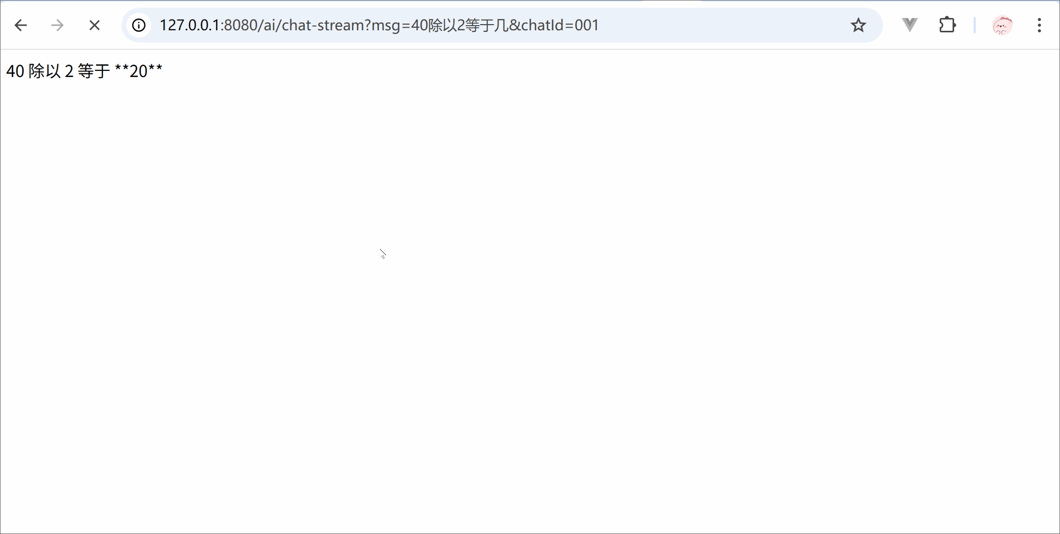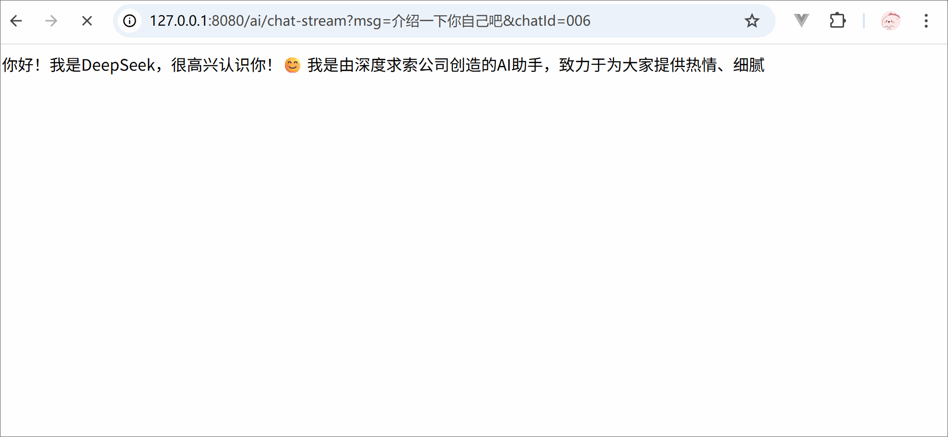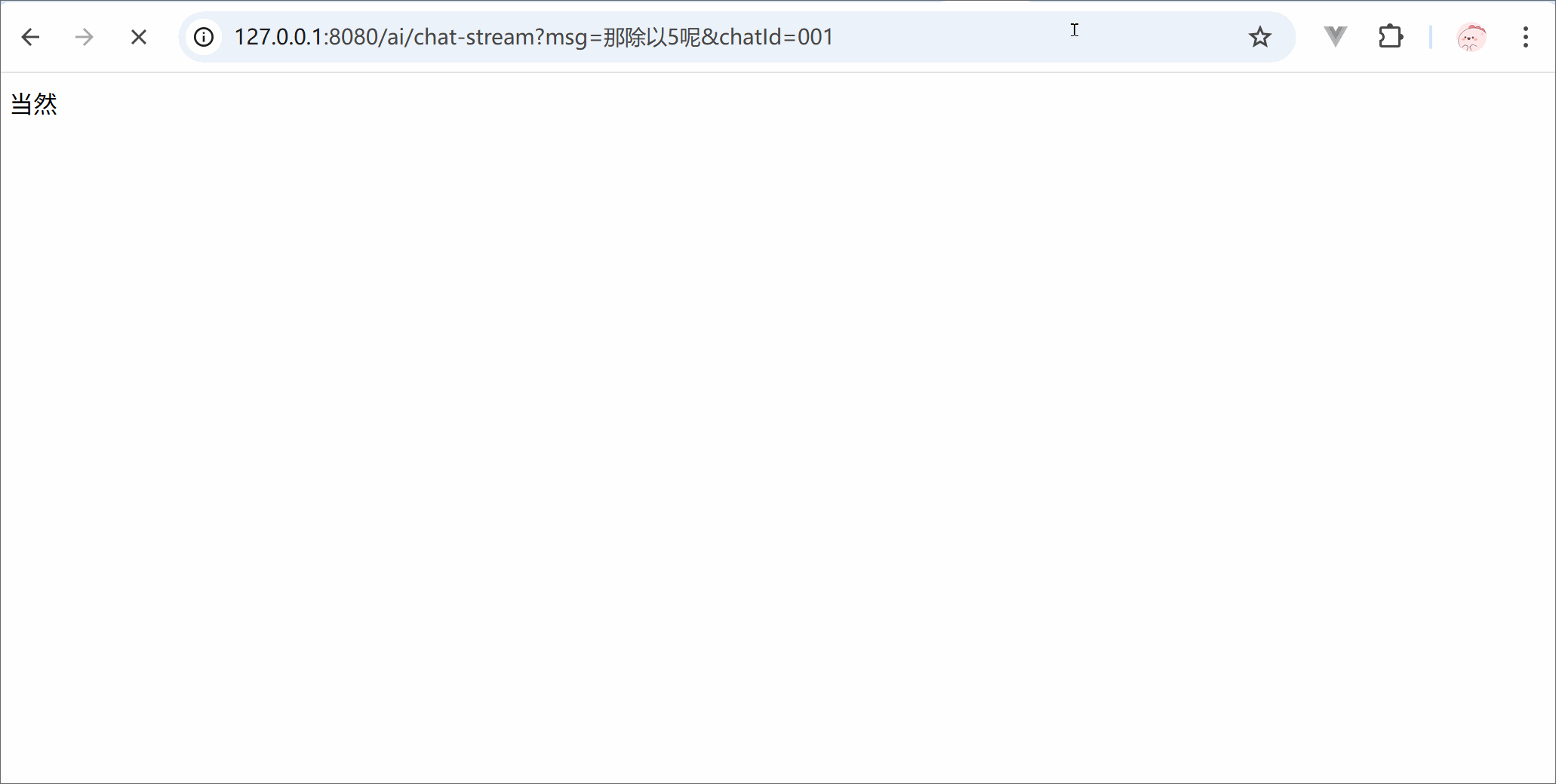 public class ChatController {@Resourceprivate ChatClient chatClient;@GetMapping(value = "chat-stream")public String stream(String msg) {return chatClient.prompt().user(msg).call().content();}}