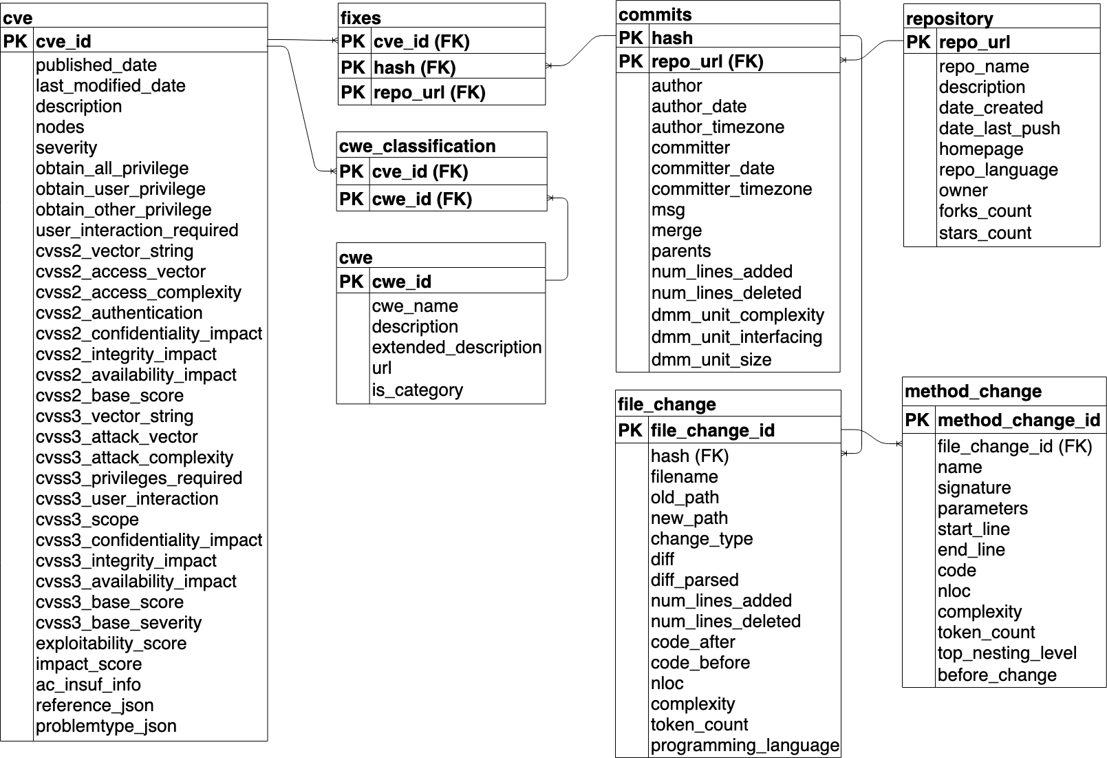 数据库表与字段详情:https://github.com/JafarAkhondali/Morefixes/blob/main/Doc/DataDictionary.md