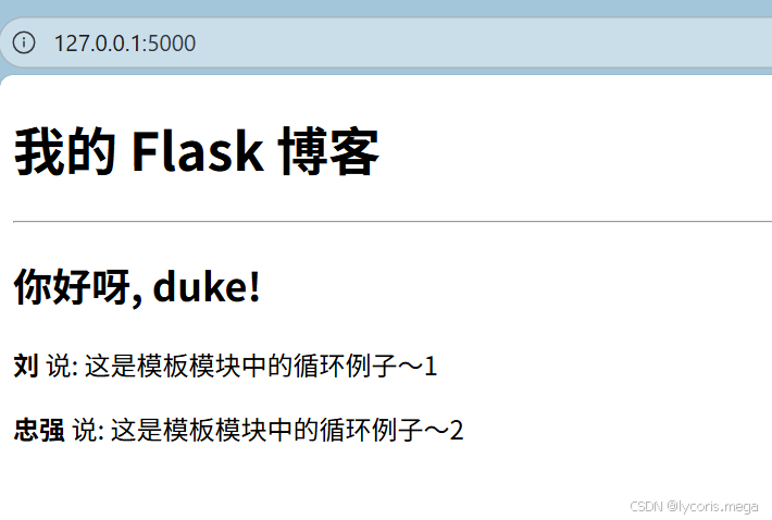 def index():user = {'username': 'duke'}posts = [{'author': {'username': '刘'}, 'body': '这是模板模块中的循环例子~1'},{'author': {'username': '忠强'}, 'body': '这是模板模块中的循环例子~2'}]return render_template('index.html', title='我的博客', user=user, posts=posts)