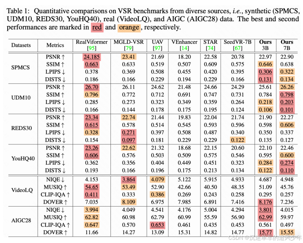按照先前工作 [97],评估合成基准,包括 SPMCS、UDM10、REDS30和 YouHQ40,采用与训练中相同的降质设置。测试分辨率为 720p,放大因子为 4。此外,还在常用的真实世界数据集(VideoLQ)和自采集的 AIGC 数据集(AIGC28)上评估性能,AIGC28 包含 28 个具有不同分辨率和场景的 AI 生成视频。使用一系列指标来评估帧级和整体视频质量。对于合成配对数据集,采用全参考指标,包括 PSNR、SSIM、LPIPS和 DISTS。对于真实世界和 AI 生成内容(AIGC)的测试数据,由于缺乏真值,完全依赖无参考指标,即 NIQE、CLIP-IQA、MUSIQ 和 DOVER。为确保测试效率,最大输出分辨率限制为 1080p,时长保持不变。