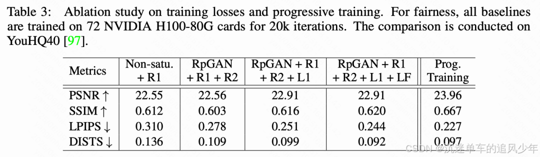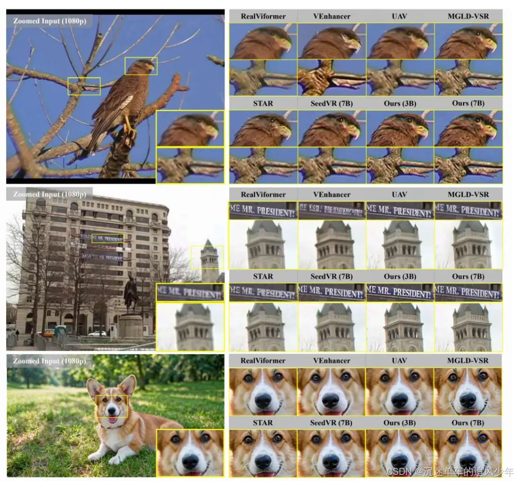 渐进式蒸馏。直接将对抗训练应用于从初始多步模型获得一步模型,可能因初始模型与目标模型之间的巨大差距而削弱模型的恢复能力。采用渐进式蒸馏来缓解这一问题。具体而言,我们从使用 64 个采样步数的 SeedVR 初始化的教师模型开始,以步长为 2 渐进地将学生模型蒸馏为一步模型。每一次蒸馏过程大约进行 10K 次迭代,使用简单的均方误差损失。还在对抗训练中逐步增加训练数据的时间长度,从图像过渡到具有不同帧数的视频片段,从而实现对不同长度视频(包括图像)的鲁棒 VR 性能。得益于这种训练策略,进一步从原始的 7B 模型蒸馏出一个 3B 模型,在模型尺寸减半的情况下实现了相当的性能。