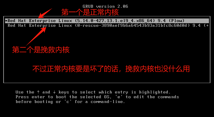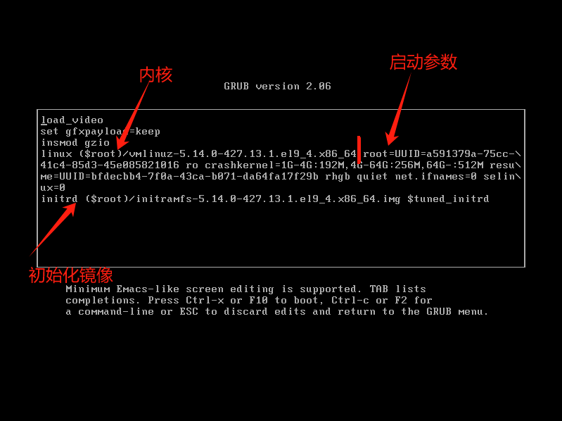 读完这两个文件后,没问题就开始启动内核(vmlinuz-5.14.0-427.13.1.el9_4.x86_64),它的主要作用是只读挂载根分区(/)