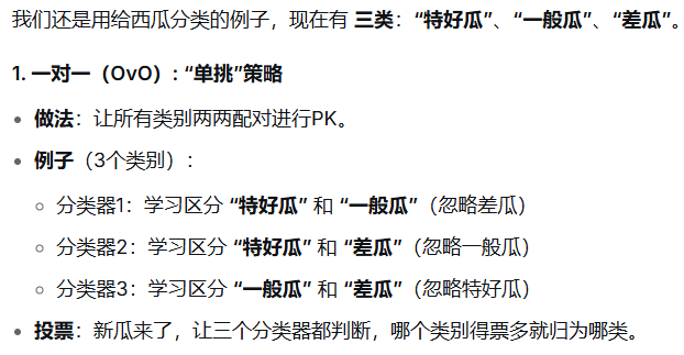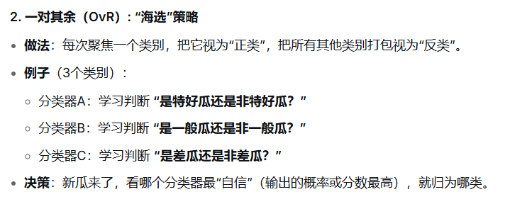 | OvO(一对一) | 循环单挑赛 | 两两配对,训练多个分类器 | 训练每个分类器只用两类数据,相对简单 | 分类器数量多(N(N-1)/2) |