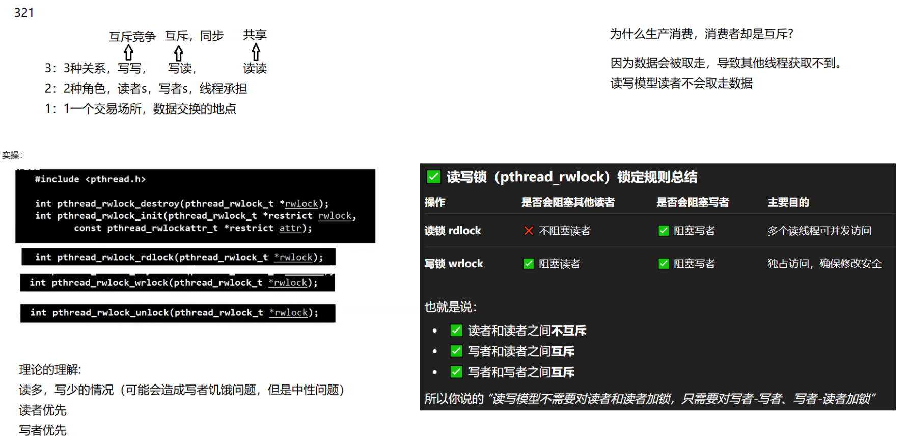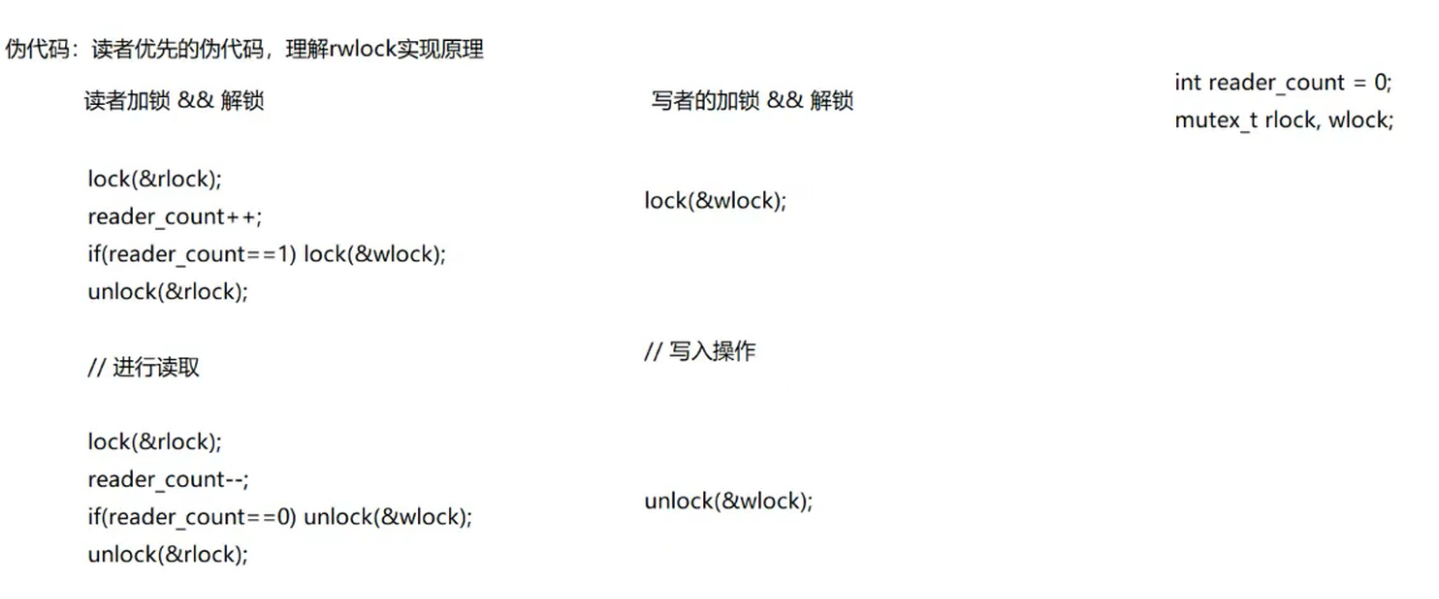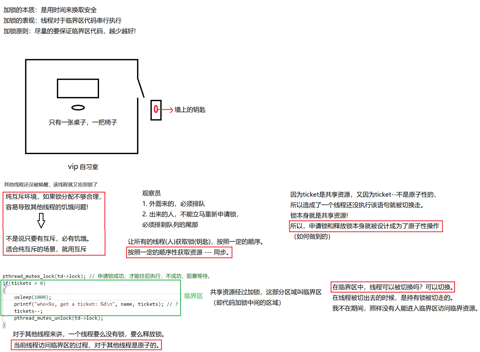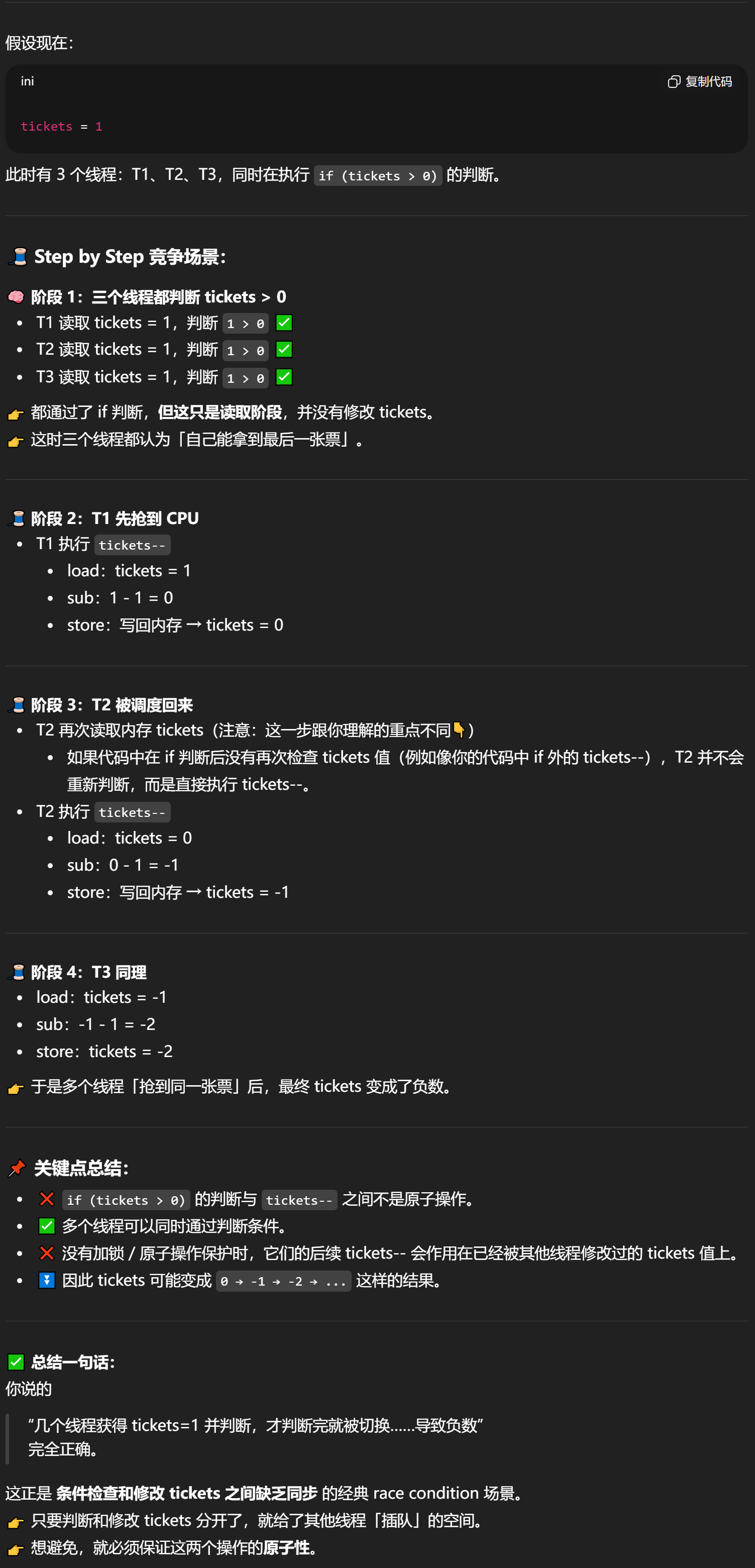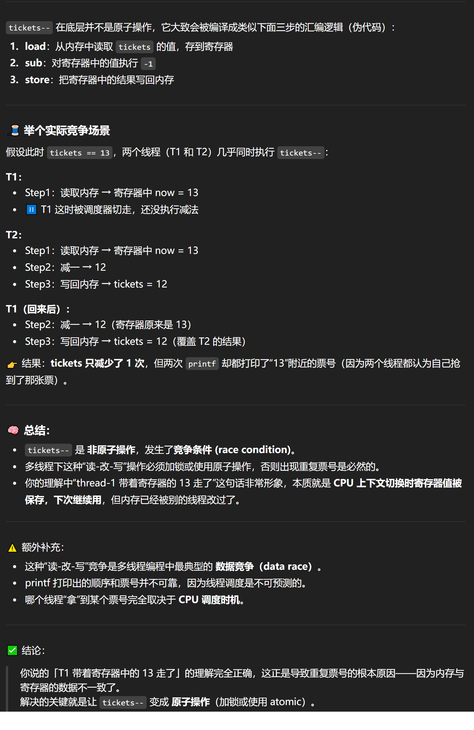 void* getTicket(void* args) {threadData* td = static_cast<threadData*>(args);const char* name = td->threadname.c_str();while (true) {//线程对于锁的竞争能力可能会不同pthread_mutex_lock(td->lock);//线程申请锁成功,才能往后执行;不成功,阻塞等待if (tickets > 0) {printf("who=%s, get a ticket:%d\n", name, tickets);tickets--;pthread_mutex_unlock(td->lock);}else {pthread_mutex_unlock(td->lock);break; }//如果下面这行,基本都是一个线程在抢票或一个线程会连续抢票usleep(13);//抢到了票,还会立马抢下一张吗。其实多线程还要执行得到票后的后续动作,usleep模拟该动作}printf("%s ... quit\n", name);return nullptr;// //该版本,else break有问题。// //如果没有票了,那么就会执行else break,即不会执行最后的解锁。// //这样会导致锁资源一直未就绪,即其他线程一直卡在申请锁资源这里// while (true) {// pthread_mutex_lock(td->lock);//线程申请锁成功,才能往后执行;不成功,阻塞等待// if (tickets > 0) {// printf("who=%s, get a ticket:%d\n", name, tickets);// tickets--;// }// else break; // pthread_mutex_unlock(td->lock);// }// //这种方式不对。这种是一个线程抢完票才轮到下一个 // //在进入 while(true) 之前就把互斥锁 td->lock 锁住了,整个循环期间锁一直被同一个线程持有。// //结果就是:线程 A 会在拿完(或耗尽)所有票之前不会释放锁,线程 B/C/D 无法并发地进入临界区,// //只能被阻塞 —— 等于是把并发变成了串行,违背了抢票场景想要的“多个线程交替竞争”的行为。// pthread_mutex_lock(td->lock);// while (true) { // if (tickets > 0) {// printf("who=%s, get a ticket:%d\n", name, tickets);// tickets--;// }// else break; // }// pthread_mutex_unlock(td->lock);