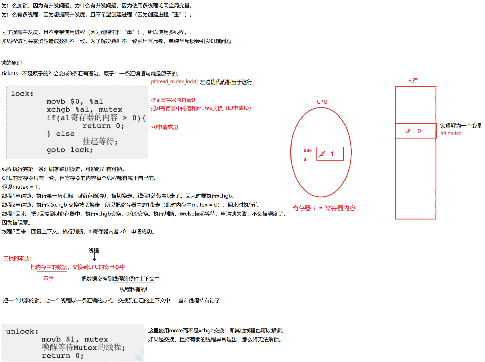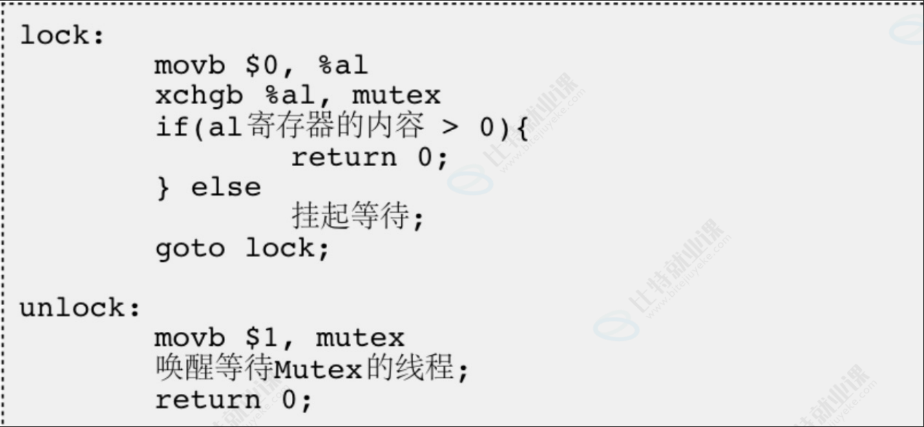 - 为了实现互斥锁操作,大多数体系结构都提供了swap或exchange指令,该指令的作用是把寄存器和内存单元的数据相交换,由于只有一条指令,保证了原子性,即使是多处理器平台,访问内存的 总线周期也有先后,一个处理器上的交换指令执行时另一个处理器的交换指令只能等待总线周期。 现在我们把lock和unlock的伪代码改一下