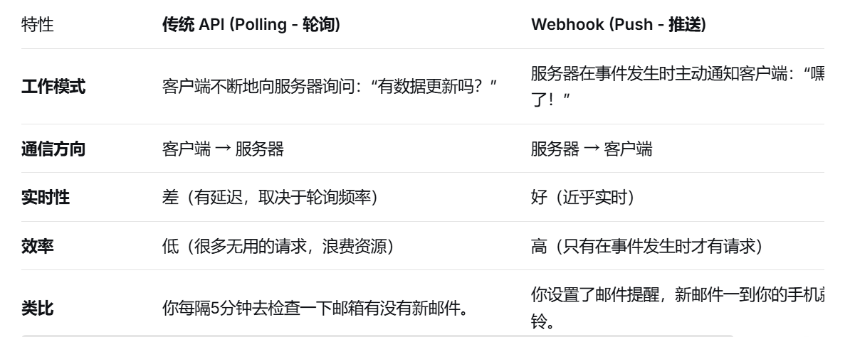 好的,我们来深入探讨一下 **Webhooks**。它是一种极其重要的“反向API”模式,是实现实时通信和自动化的关键技术。