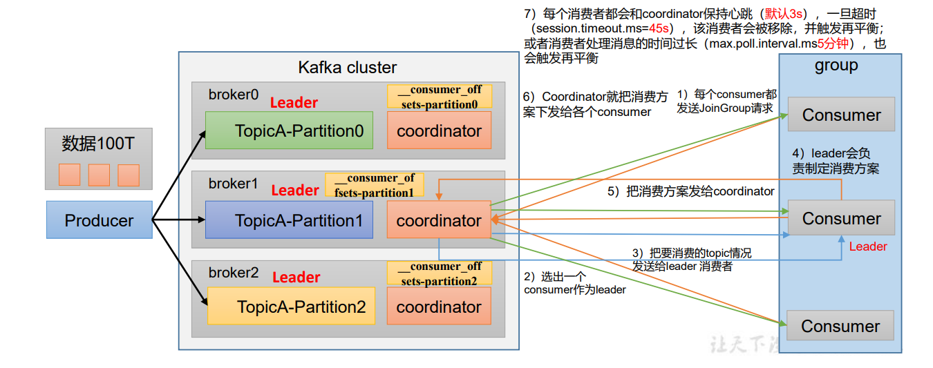 - 下发消费方案:Coordinator 将消费方案下发给组内所有消费者,消费者根据方案确定自己负责的分区。