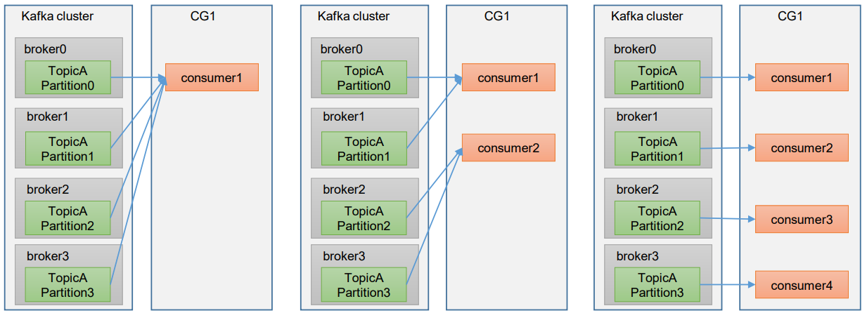 - 如果向消费组中添加更多的消费者,超过主题分区数量,则有一部分消费者就会闲置,不会接收任何消息。