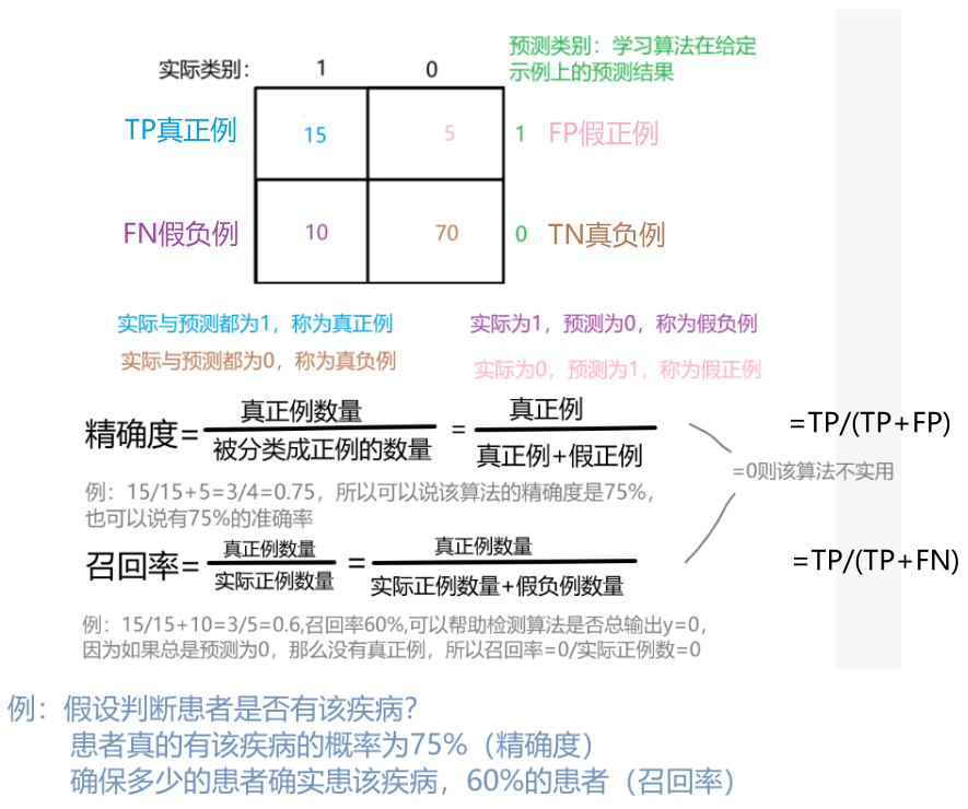 -    希望算法具有高精确度和高召回率 - 高精度(意味着如果它诊断出某人患有罕见病概率是多少)、高召回率(意味着若患者患罕见病,算法可以正确识别的概率)。