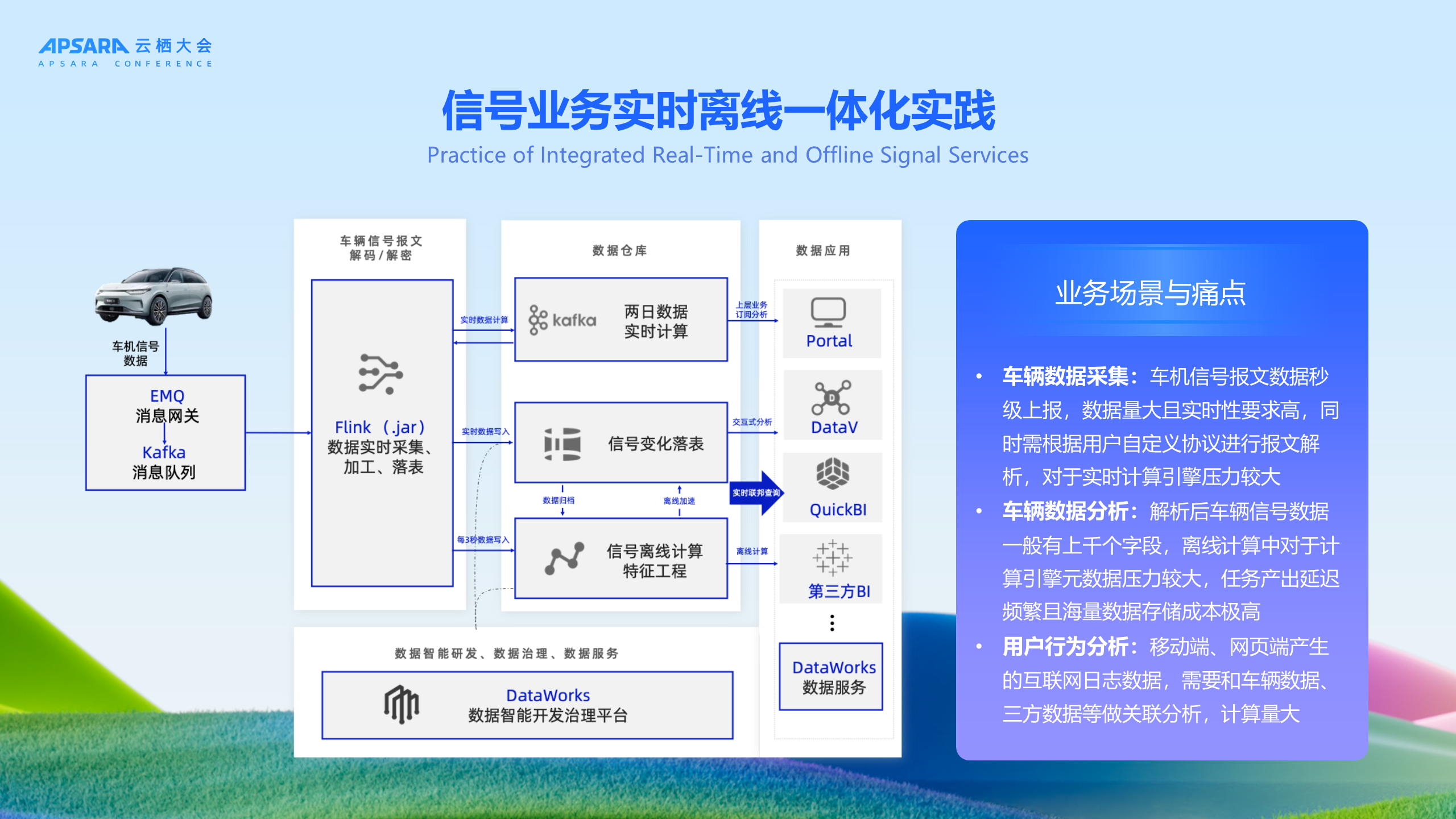在数据流转过程中,面临着多重挑战。数据量巨大,目前已达PB级规模;大多数应用场景下,需要对信号数据进行实时切片处理;信号数量众多,高端车型的信号数远超8000个;需求应用场景繁多;数据结构极为复杂。