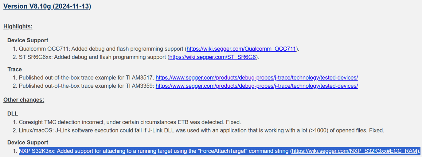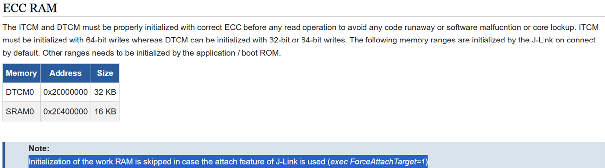 J-Link有相关的说明:即NXP S32K3 ITCM区域(0x20000000- 0x20008000)和SRAM区域(0x20400000- 0x20404000)在连接的时候默认会被初始化成默认值(0xDEADBEEF)。如果Attach操作不想初始化对应的区域,需要使用attach相关命令exec ForceAttachTarget=1: