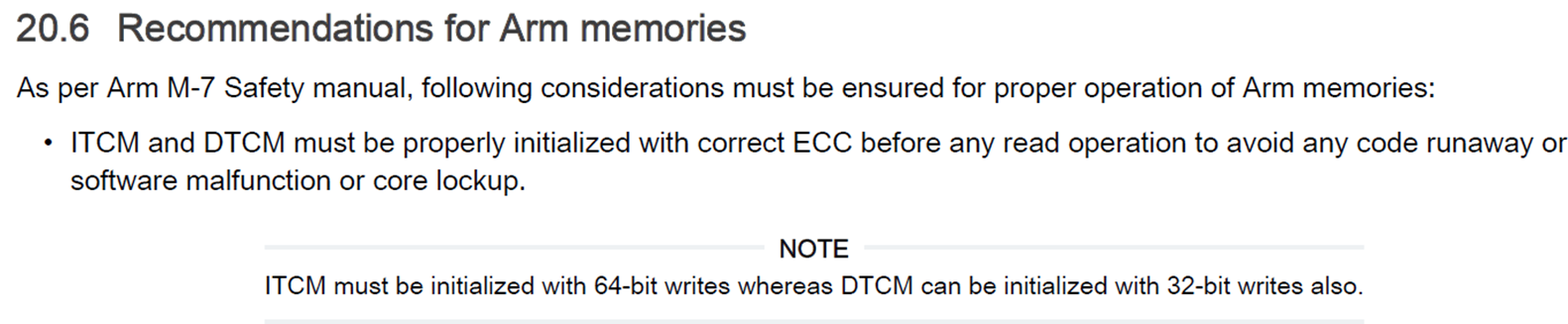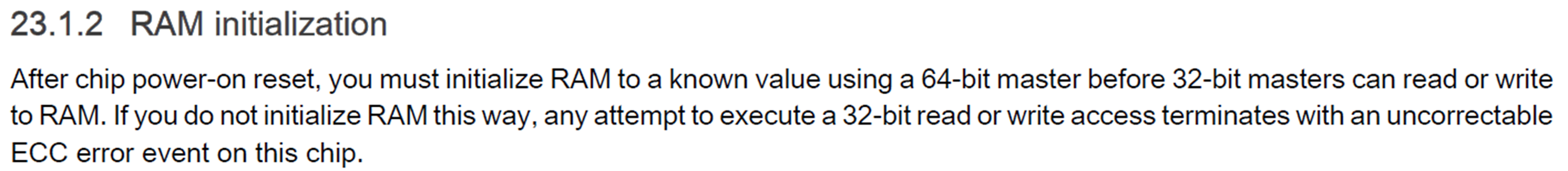 NXP S32K3的ITCM/RAM有ECC机制,而程序下载到Flash是通过运行在ITCM/RAM中Flashloader完成的,在将Flashloader搬运到ITCM/RAM之前,需要对相关ITCM/RAM内存区域按照ECC的位宽(NXP S32K3对应的是64bit)先进行写操作(上电复位之后ITCM/RAM必须先按照ECC位宽进行写操作,否则会产生ECC错误):