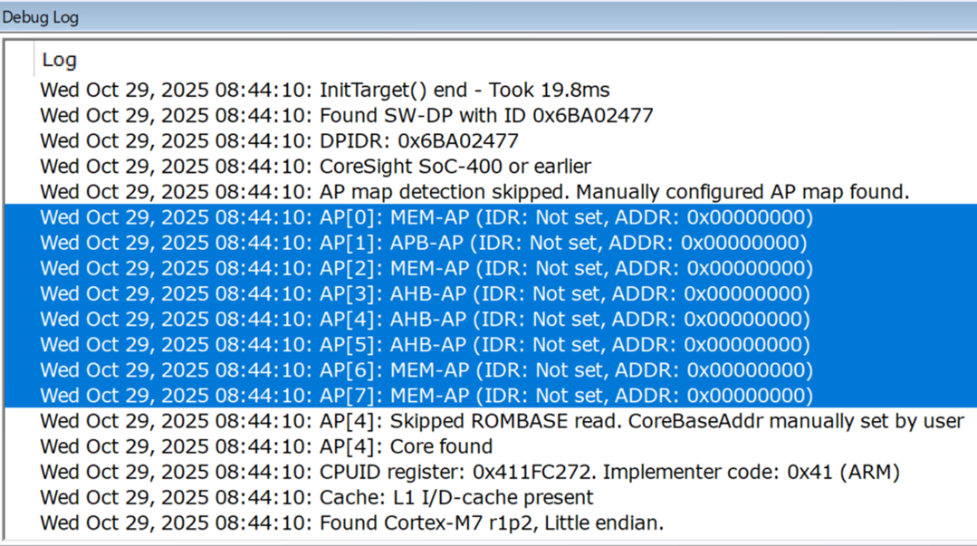 同时NXP S32K3包含很多AP,需要指定对应的AP配置信息,从而让J-Link可以正确找到对应的CPU。对应的AP配置信息可以查看正常下载调试时候的Debug Log,下面以NXP S32K324为例: