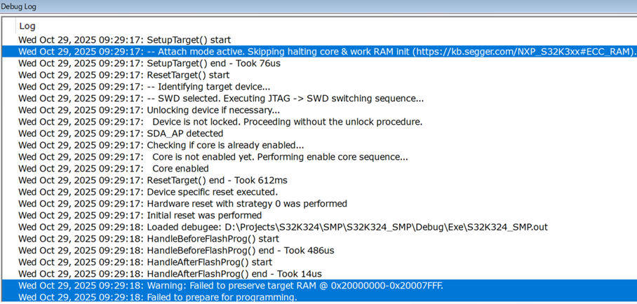 正常会提示-- Attach mode active. Skipping halting core & work RAM init (https://kb.segger.com/NXP_S32K3xx#ECC_RAM).