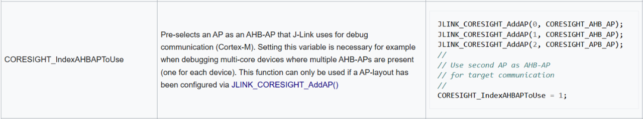上面的JLinkScript文件示例默认会选择第一个CPU,如果想选择其它的CPU,需要配置CORESIGHT_IndexAHBAPToUse变量选择对应的AP(CPU)。