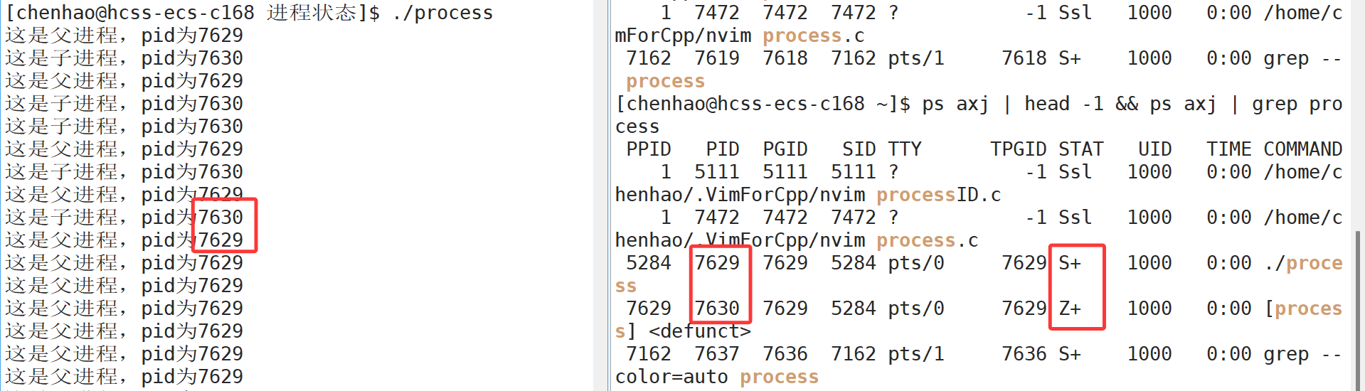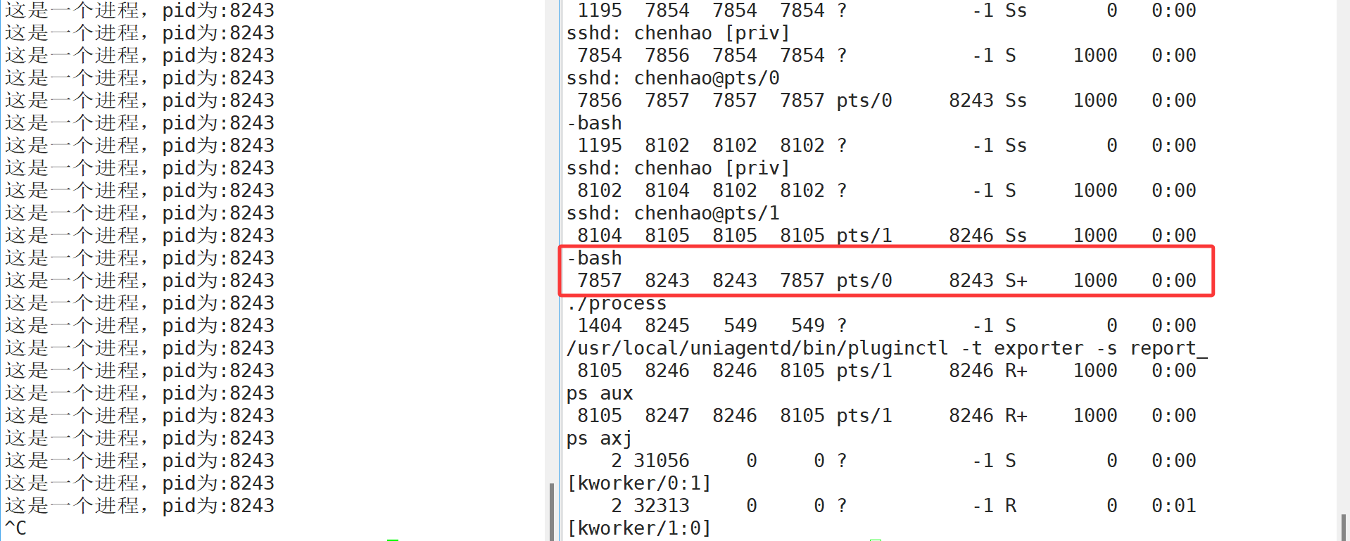 可以看到这时我们创建的进程pid为8243,而8243的状态为S+,那我们程序正在运行,应该是R状态为什么会是S+状态呢?