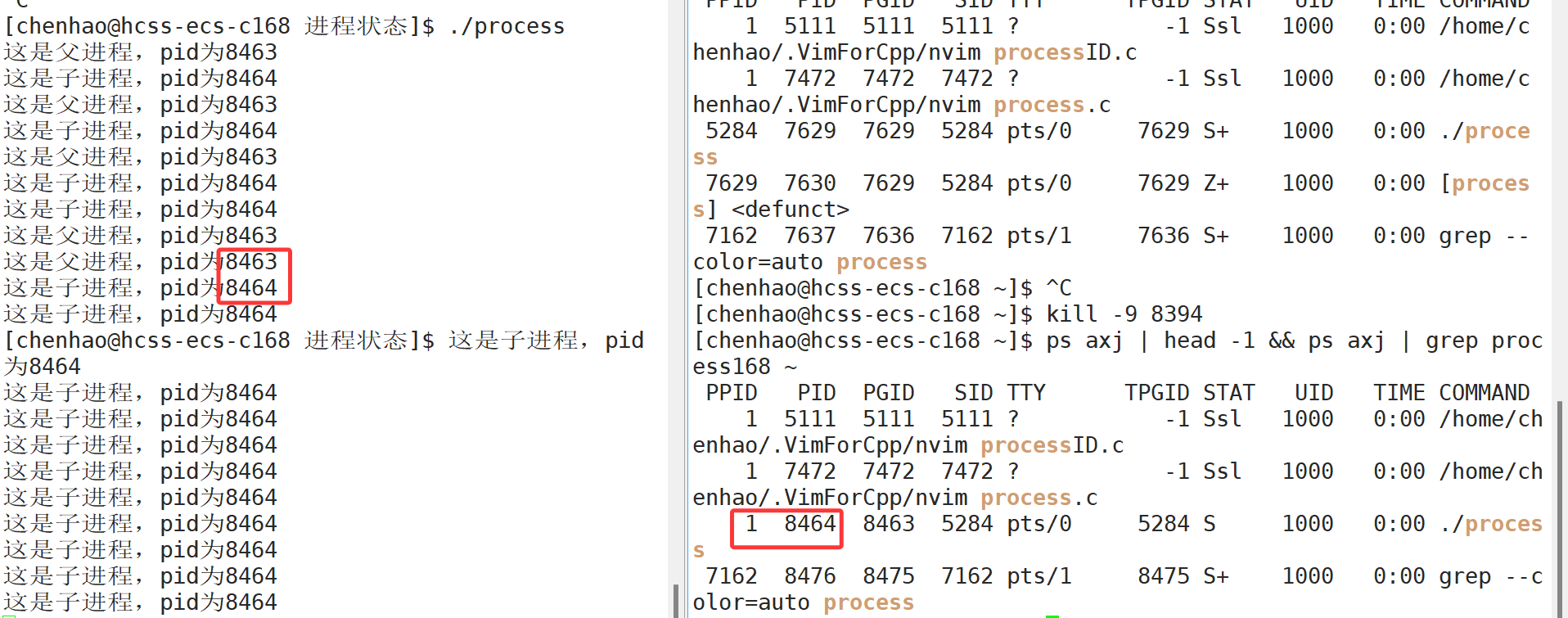 {pid_t id = fork();if(id == 0){int i = 5;for(i = 0; i < 5; i++){printf("这是子进程,pid为%d\n", getpid());sleep(1);}}else{while(1){printf("这是父进程,pid为%d\n", getpid());sleep(1);}}return 0;