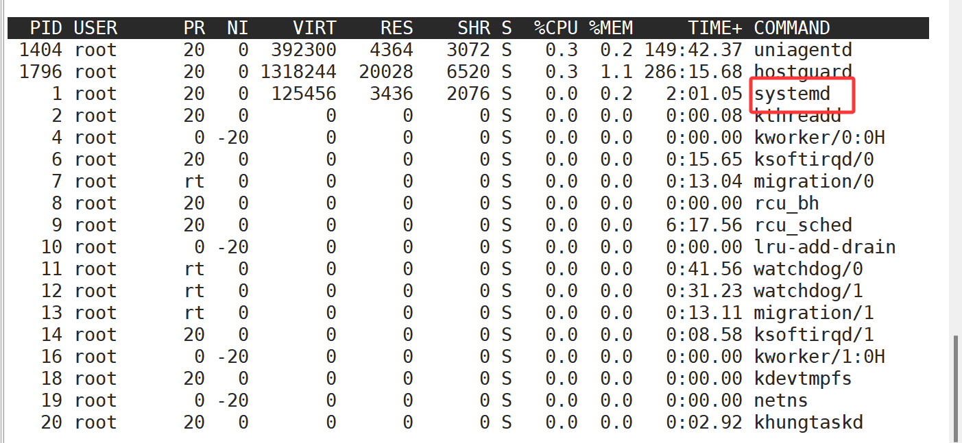 可以看到此时pid为8464的子进程在父进程优先消亡后,父进程变为了pid为1的进程,pid为1的进程是什么呢?Linux系统下我们通过top命令来查看所有运行的进程: