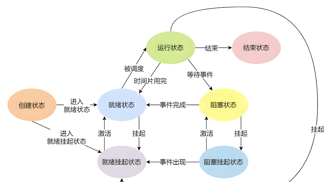 除此之外,像例子中这种在运行过程时挂起的状态叫做运行挂起;而若进程在等待硬件就绪处于阻塞状态时被挂起,则称为阻塞挂起。