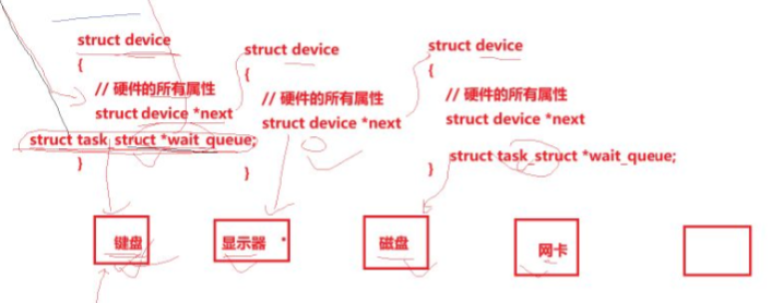 这时等待键盘输入的状态就可以称为进程阻塞了,此时的进程需要调用键盘输入,即等待键盘就绪,更进一层面也就是等待硬件就绪。那么程序怎么知道硬件就没就绪呢?操作系统作为软件与硬件的管理者,也会对硬件进行结构体描述,在每个硬件的结构体中也会有一个等待队列。因此将进程结构体处于除CPU之外队列的状态,称为阻塞状态。