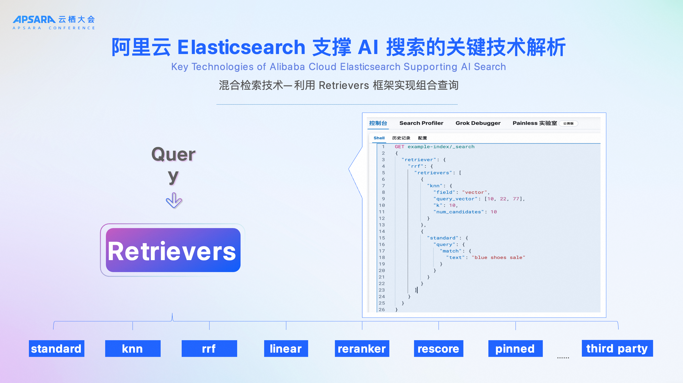 云原生内核在 Elasticsearch 中新增 Retrievers 框架,支持将多路查询(如向量检索与文本检索)的结果以组合或嵌套的形式整合成单一路径返回。框架内置多种结果融合方式,包括: