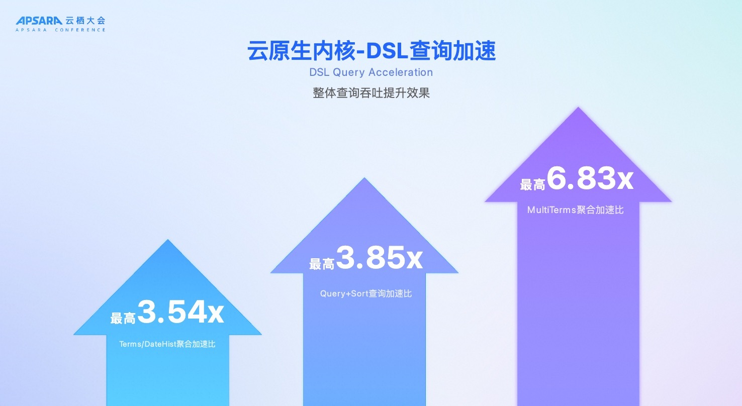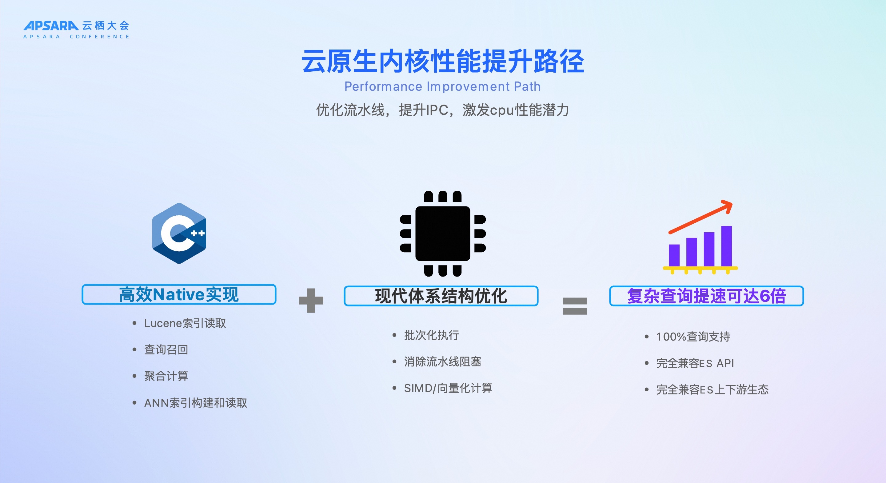云栖大会重磅发布的基于 C++ 从0到1自主研发的云原生内核——阿里云 Elasticsearch 云原生内核打造极致性能,在召回排序、聚合性能和向量检索全方位性能大幅提升。通过 高效 Native 实现 + 现代体系结构优化,显著释放了 CPU 潜能,使复杂查询提速最高可达 6 倍。