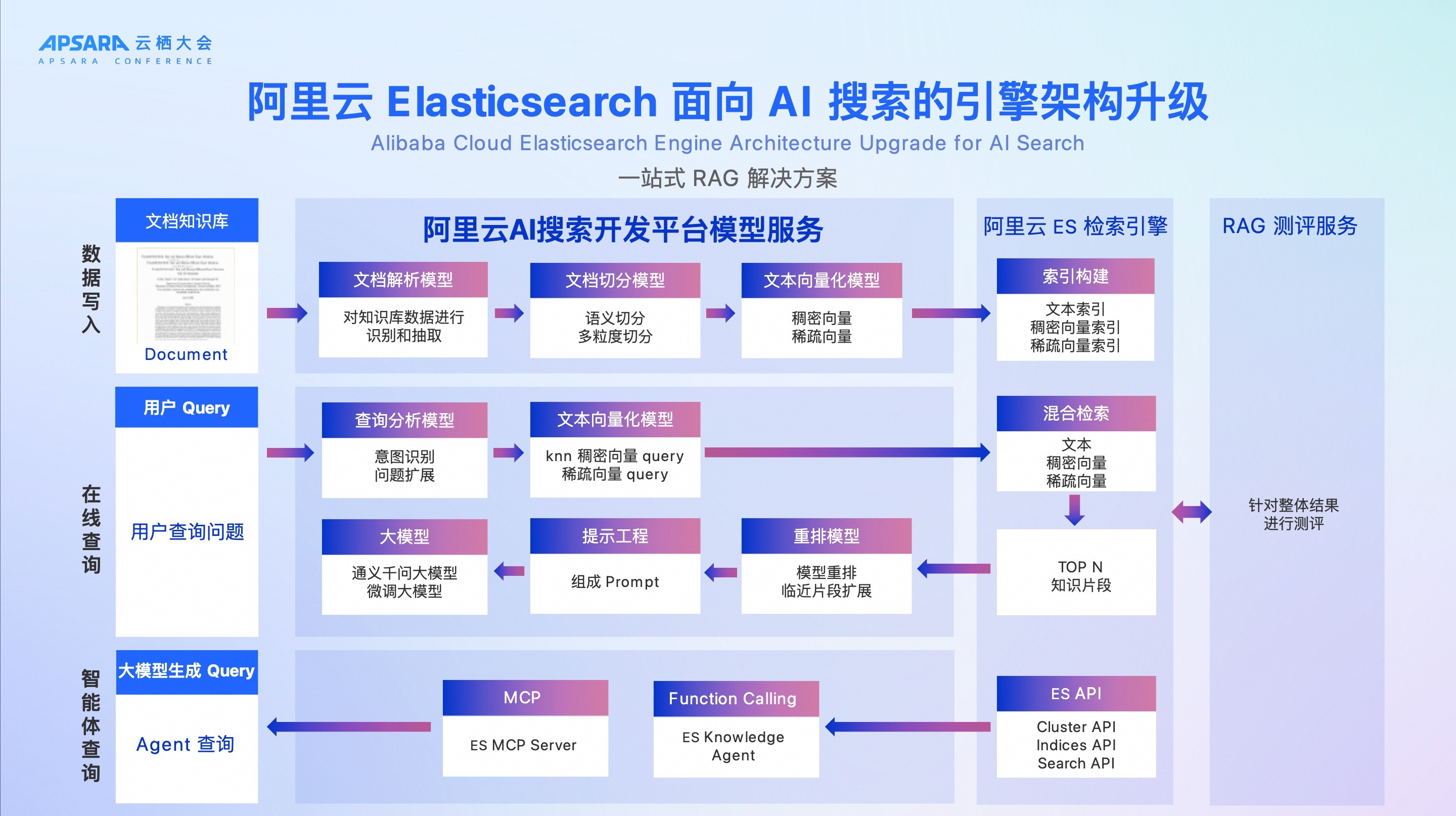 阿里云 Elasticsearch 面向 AI 搜索的引擎架构升级,重点推出了一站式 RAG(Retrieval-Augmented Generation) 解决方案,实现了从数据接入、在线查询到智能体调用的全链路闭环,覆盖模型服务、搜索引擎与评测优化等核心环节:
