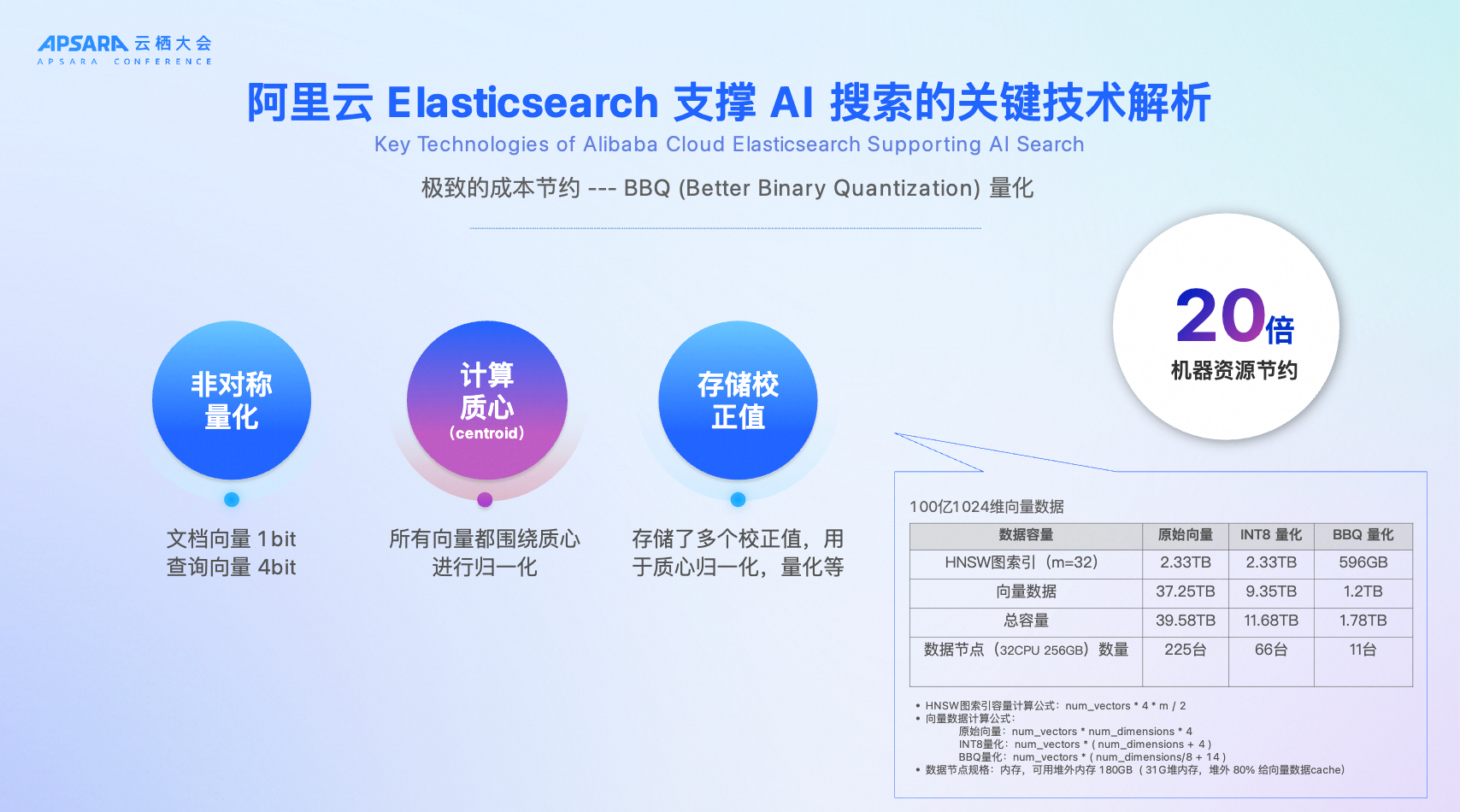 在 100 亿、1024 维的场景下,BBQ 量化可将机器需求从 225 台降至 11 台,机器资源节约节省资源 20 倍。