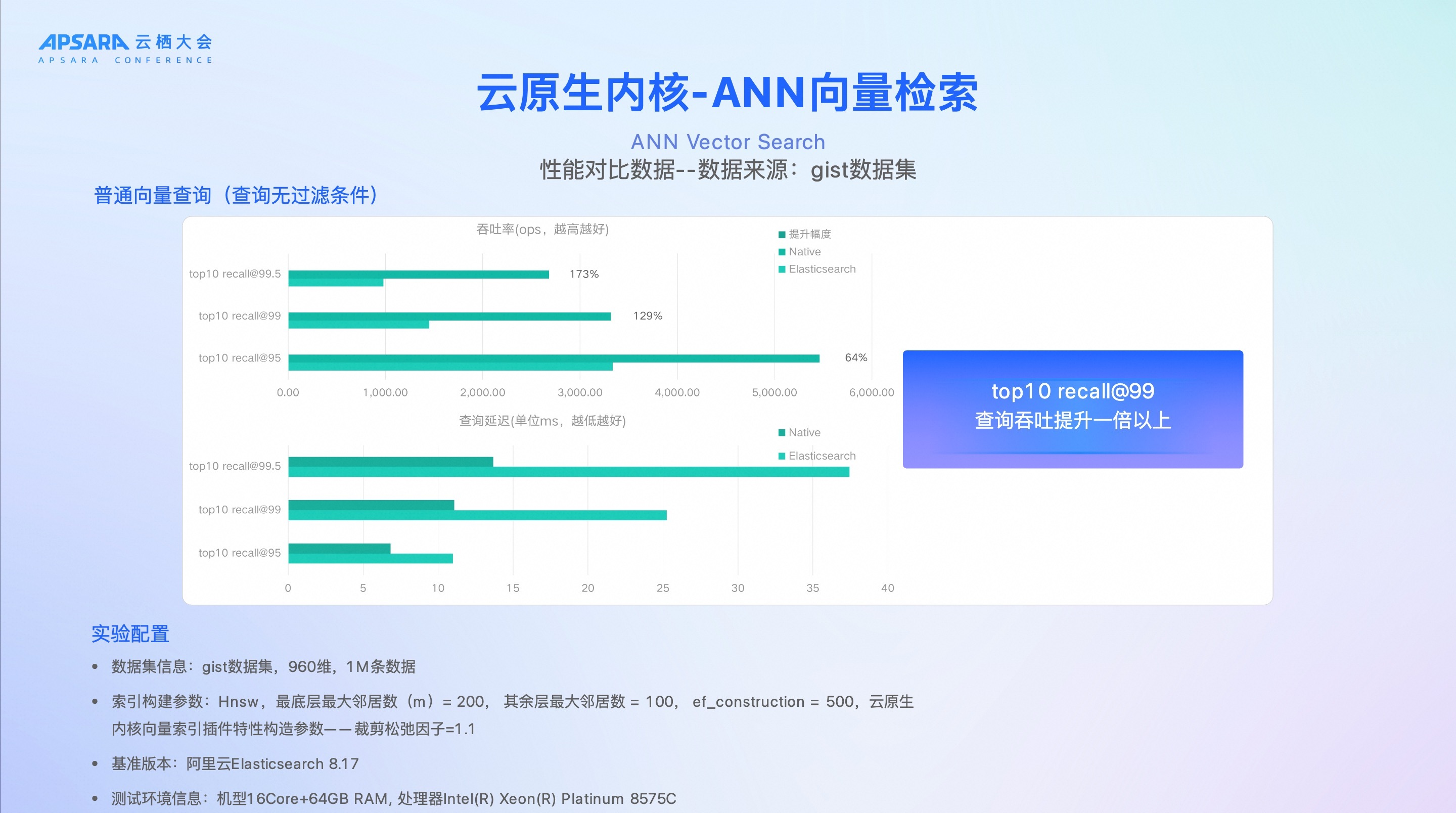 在 gist 数据集(960维,1百万数据)上的基准测试中,阿里云 Elasticsearch 云原生内核的 Native 执行引擎 相比原生 ES 8.17 展现了显著的吞吐与延迟优势。