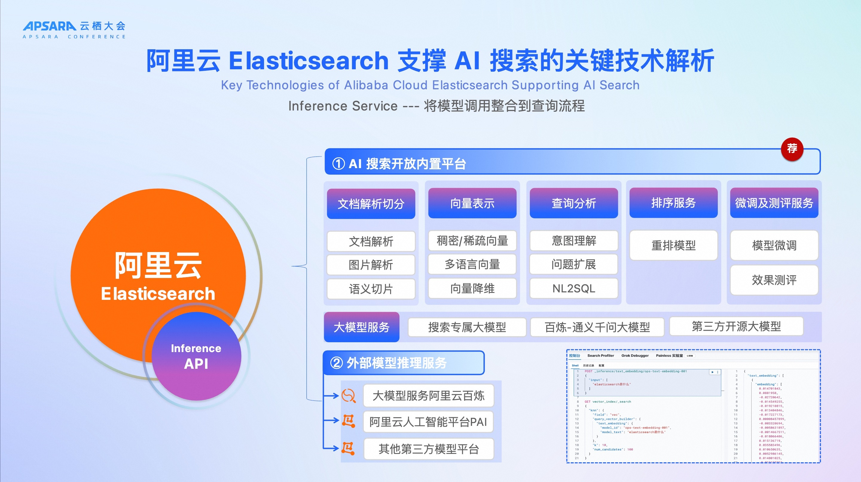 在全新架构中,阿里云 Elasticsearch 通过 Inference API 将模型调用能力深度整合到查询流程,实现了 AI 搜索的端到端智能化处理。系统由 AI 搜索开放内置平台 与 外部模型推理服务两大部分构成,形成了完整的、可扩展的模型推理体系。