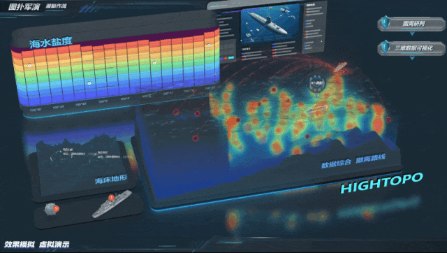 在潜艇作战的图扑军演场景中,热力图是关键的态势感知工具。它依托海洋环境多源数据,以色彩梯度直观呈现海底相关要素的分布与变化。