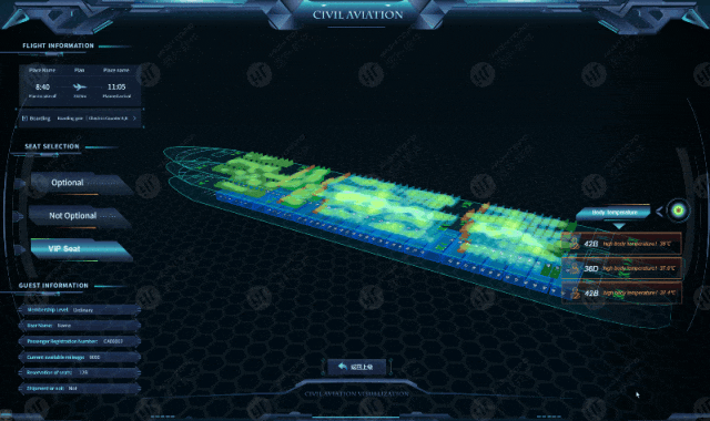 民航客舱热力图展示乘客分布与体温等健康信息,不同颜色对应乘客密度或体温状况。机组人员可快速掌握人员集中区域以提供针对性服务,特殊时期还能快速筛查体温异常乘客,保障航班安全与乘客健康,也有助于优化座位安排,提升乘机舒适度。