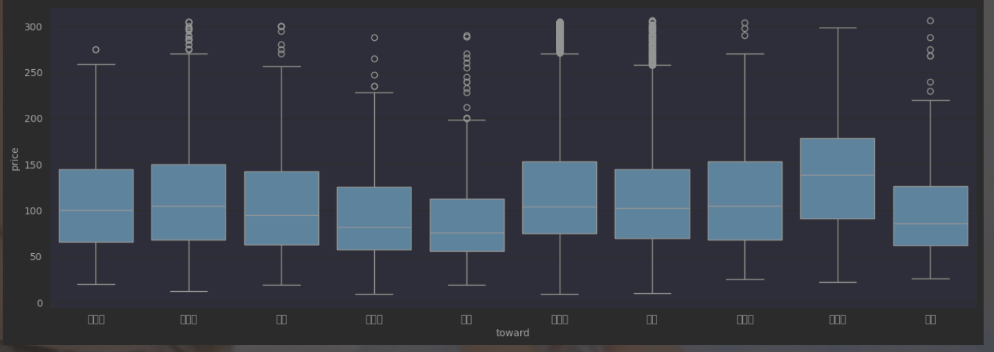 df.groupby('toward').agg({'price':['mean','median'],'unit':'median','building_age':'mean',