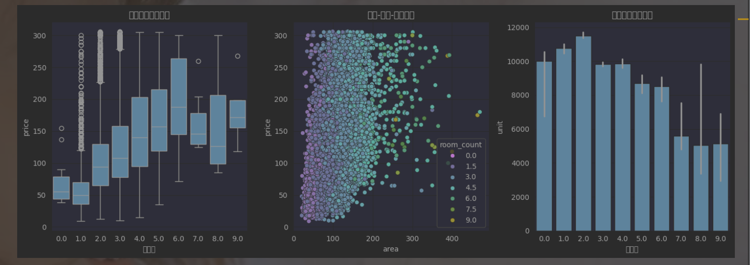plt.title('面积-价格-户型关系')plt.subplot(133)