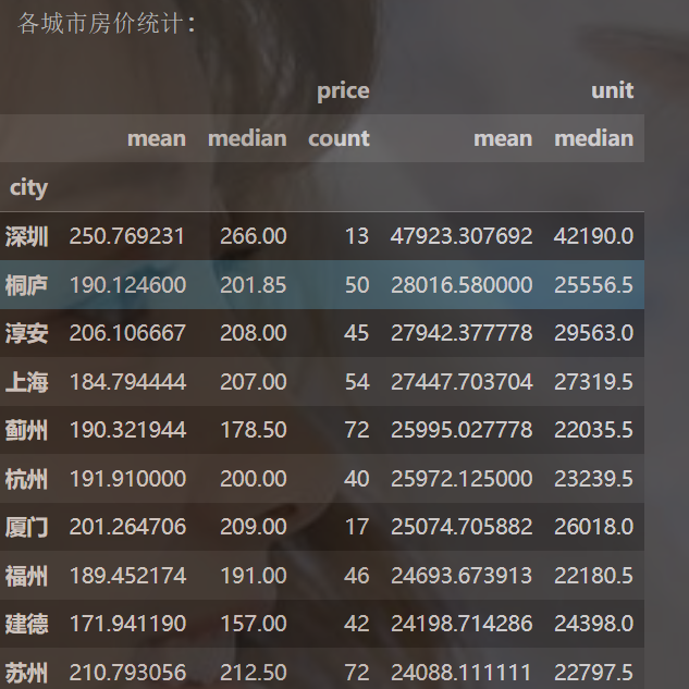 display(city_stats.sort_values(('unit', 'mean'), ascending=False).head(10))# 可视化前10城市